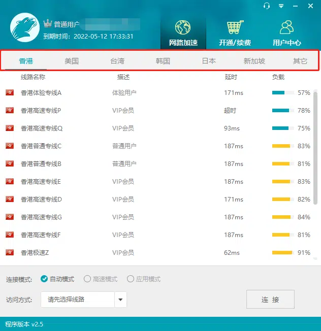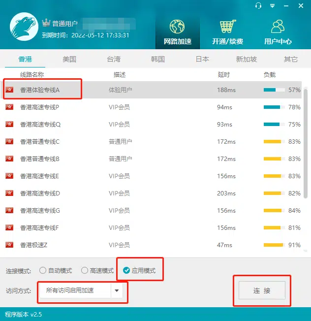 3、选中【香港体验专线A】,把最下方的自动模式改为【应用模式】,并且把访问方式选择为【所有访问启用加速】,最后点击右下角【连接】