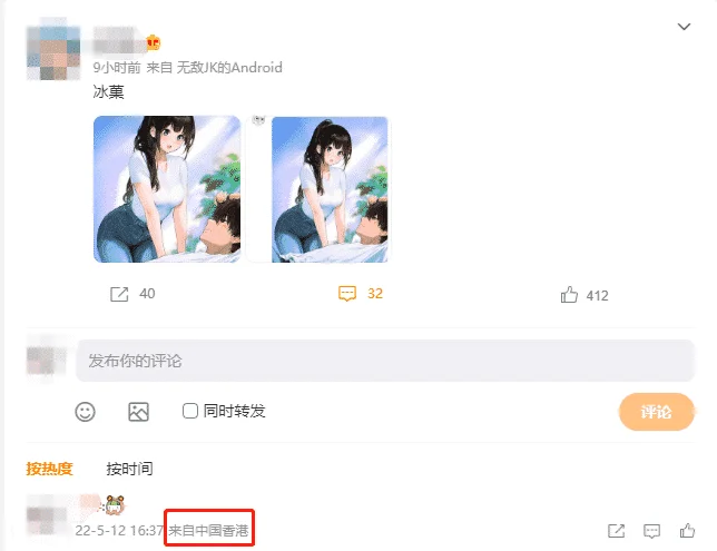 由于我们连接的是中国香港的 IP ,那么很显然,发布评论之后,在微博中我们的 IP 属地会变为中国香港: