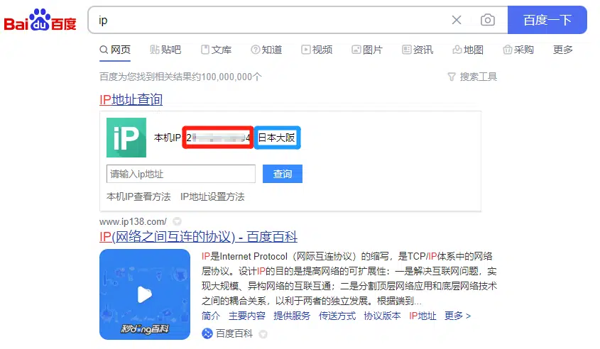 我们可以用一个最最最简单的方式教会你查询并区分出电脑端的 IP 属地和 IP 地址:你只需要用电脑打开 Baidu ,输入 IP 后搜索,搜索出的第一个结果中,红色方框中圈出的数字就是 IP 地址,蓝色方框中圈出的就是 IP 属地。
