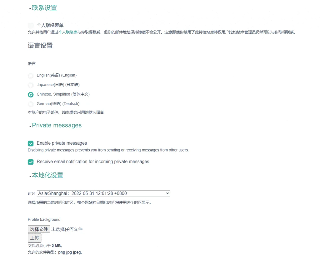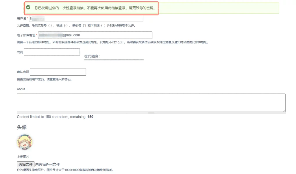登录进来之后,系统会告诉你,你已经使用过一次性登录链接,后续就不能再使用了,然后你需要在这个页面内设置你的密码、个人简介、头像、时区、语言等等。