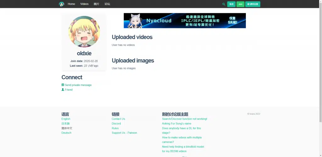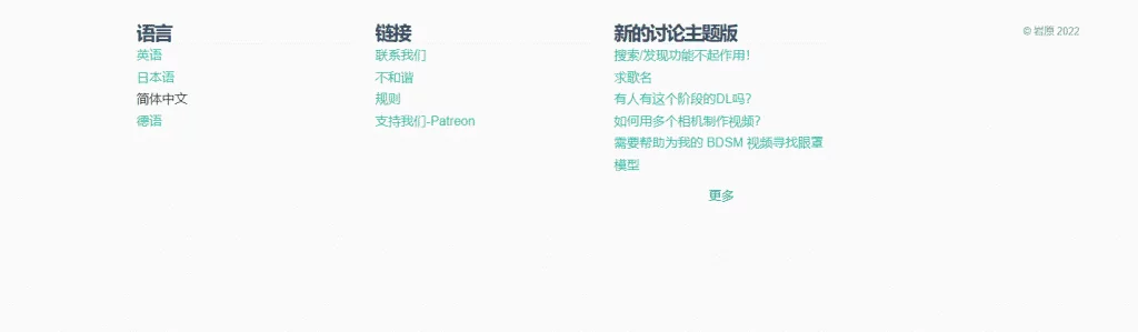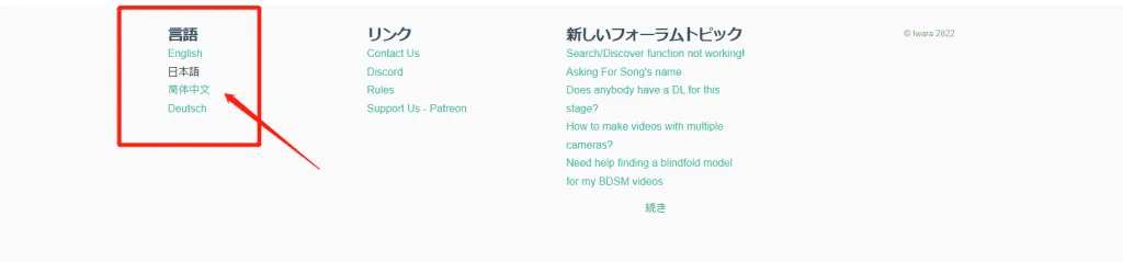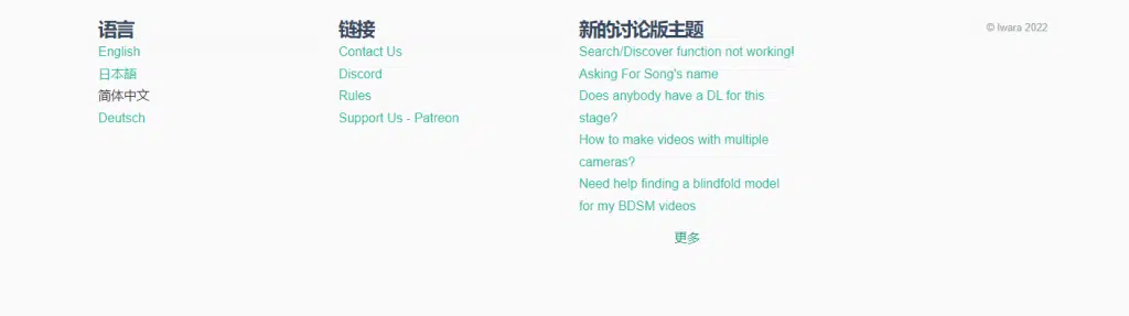 回归正题,进入 iwara 网站之后,会看到页面内都是视频以及日文,看不懂咋办?我们可以把页面下拉至最底部,也就是底部菜单栏位置,在最左侧一列,可以看到语言设置选项,点击【简体中文】,即可切换,如图所示: