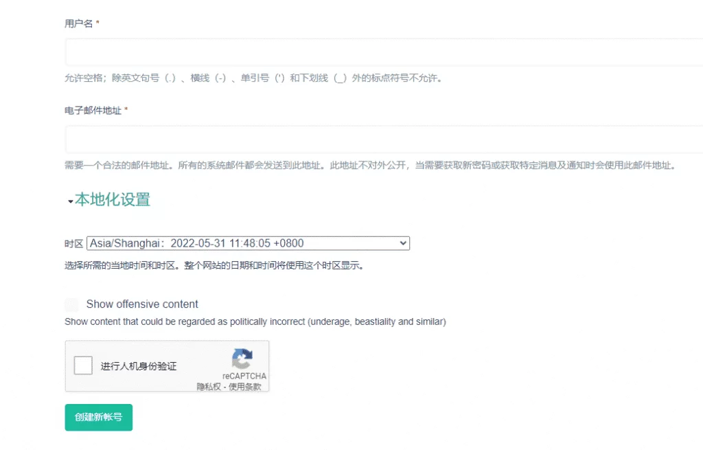 在此页面内你需要设置你的用户名,用户名随便起一个都可以,但是不能跟已有的用户名重复;填写电子邮箱地址,这个电子邮箱建议是使用国外的邮箱账号,比如 Gmail 、Hotmail 等等,否则很有可能收不到验证邮件,就像你手机注册收不到验证码一样;时区系统会默认帮你选择,这里我们就选择上海时间即可;点击完成人机身份验证,最后点击创建新账号。