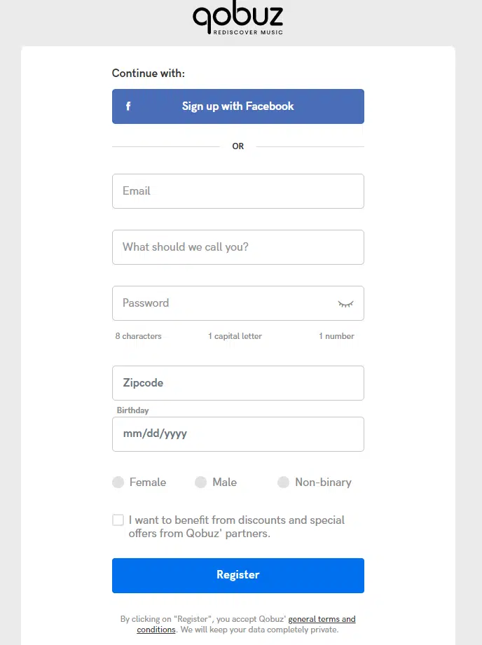 在 Qobuz 官网首页内点击【TRY FOR FREE】就可以弹出注册页面,如果你已有 Facebook 账号,可以直接点击【Sign up with Facebook】,通过 Facebook 账号直接登录。