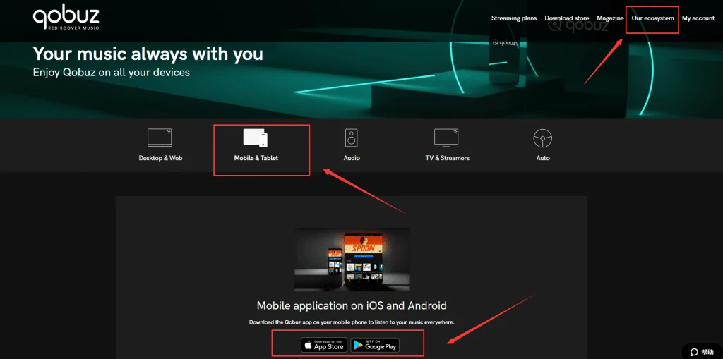Qobuz 是有提供手机端的应用程序的,如果需要下载,只需要在官网中点击菜单栏的【Our ecosystem】-在弹出的下图页面中选择【Mobile & Tablet】-根据你的端口选择你需要的应用程序进行下载,iOS 端需跳转到 App Store 中下载,安卓端则需要跳转到 Google Play 应用商店进行下载。