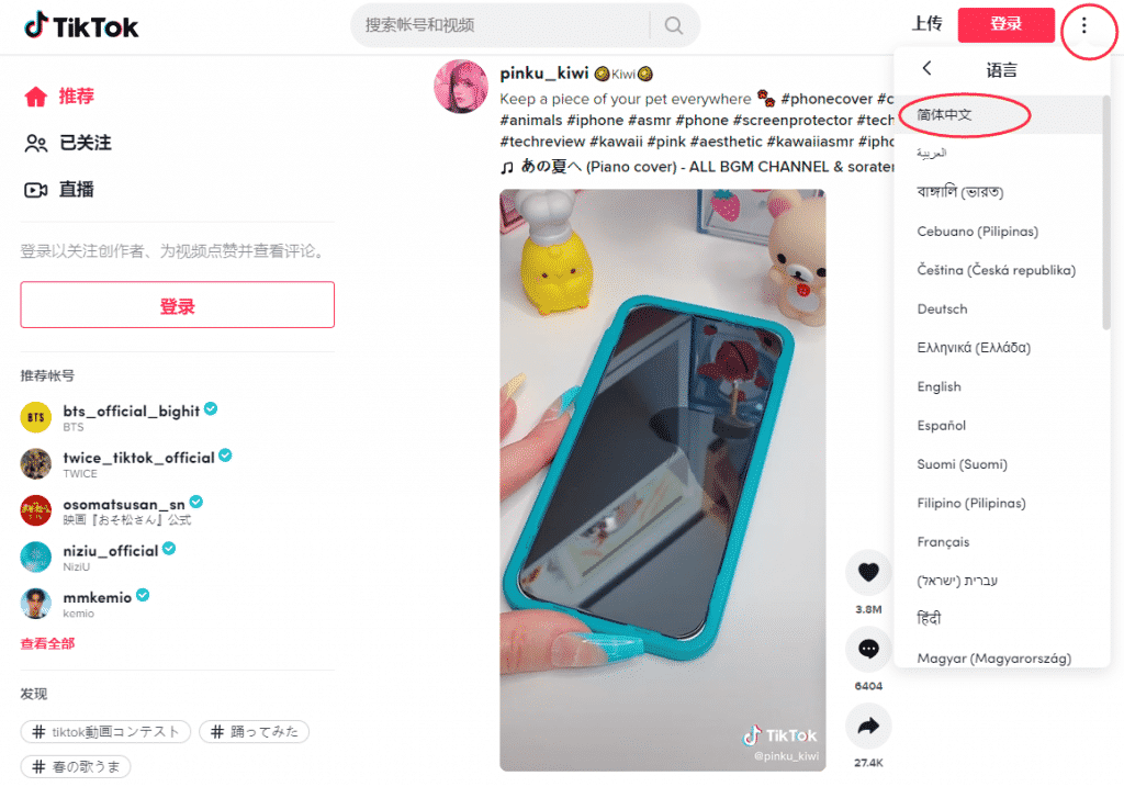 网页版中我们可以在右上角【三个点点】处找到简体中文更改;手机中同样是在设置里,点击【通用设置-切换语言】。但我们能更改的也仅仅只是系统语言,作者发的视频内容中的语言是无法更改的。