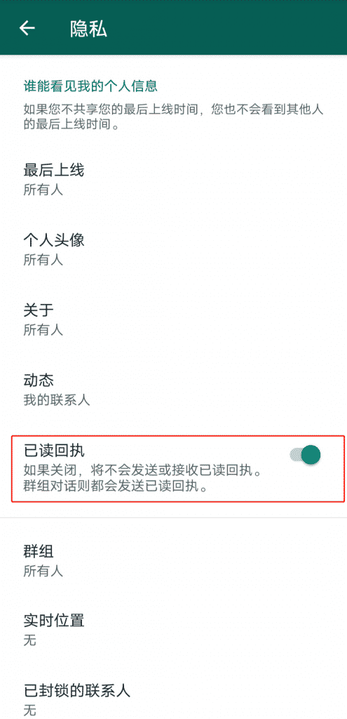 通过这些符号我们就能完全掌握对方阅读消息的进度条,那么对我们自己而言,如果我不想让别人这么盯着我?不想让他们知道我已读不回呢?我们可以在设置里关闭这项功能,操作路径为:设置-账号-隐私-已读回执。把已读回执选项关闭就可以啦。