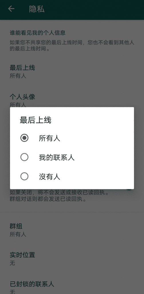 同理于已读的功能,WhatsApp 里是可以查看到对方的最后上线时间的,同样也可以对你的客户目前状态有一个判断,比如你刚刚发过去的信息,而他最后上线时间一小时前,显然对方是不能立刻回复你的(如果他刚好就突然上线了的话例外哈),那么对于我们自己,不想让其他人查看,也可以关闭这个功能。操作路径为:设置-账号-隐私-最后上线,把该选项改为【没有人】即可。注意!!!如果你不愿意共享你的最后上线时间,那么你也无法查看到别人的最好上线时间!!!鱼和熊掌不可兼得嘛。